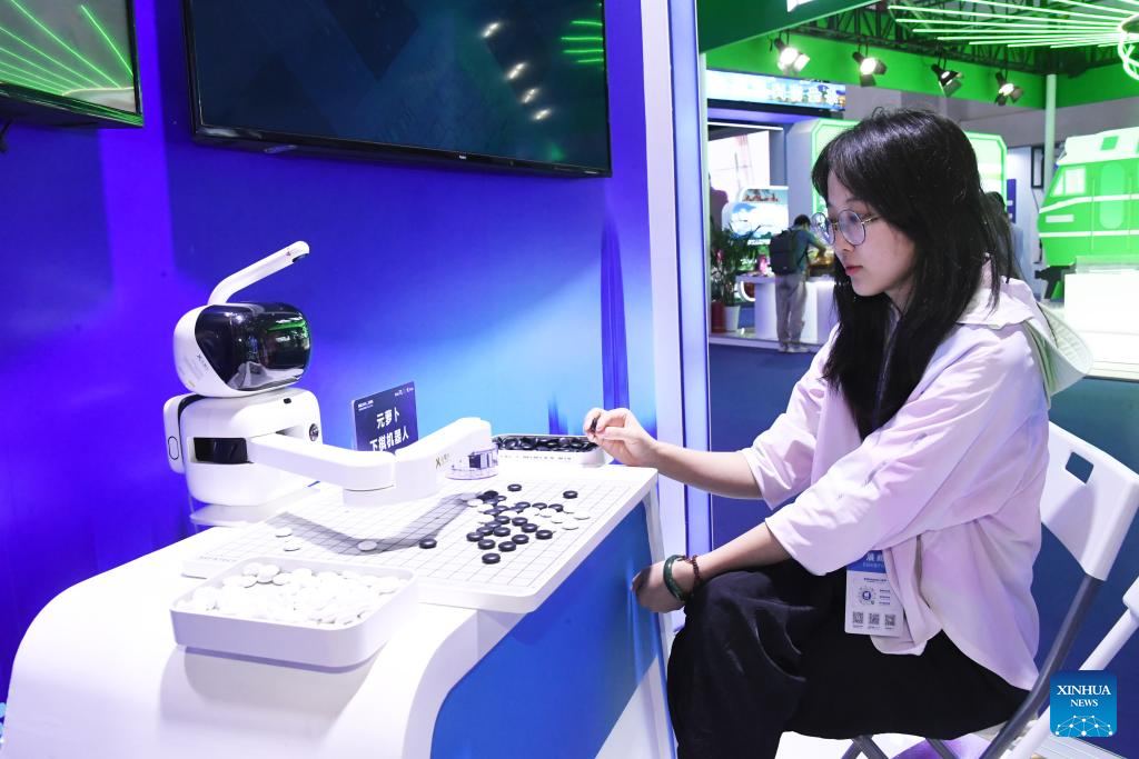 A visitor plays chess with a robot at the exhibition area of HICOOL 2024 Global Entrepreneur Summit in Beijing, capital of China, Aug. 23, 2024. The global entrepreneur summit was held in Beijing from Friday to Sunday. (Xinhua/Ren Chao)