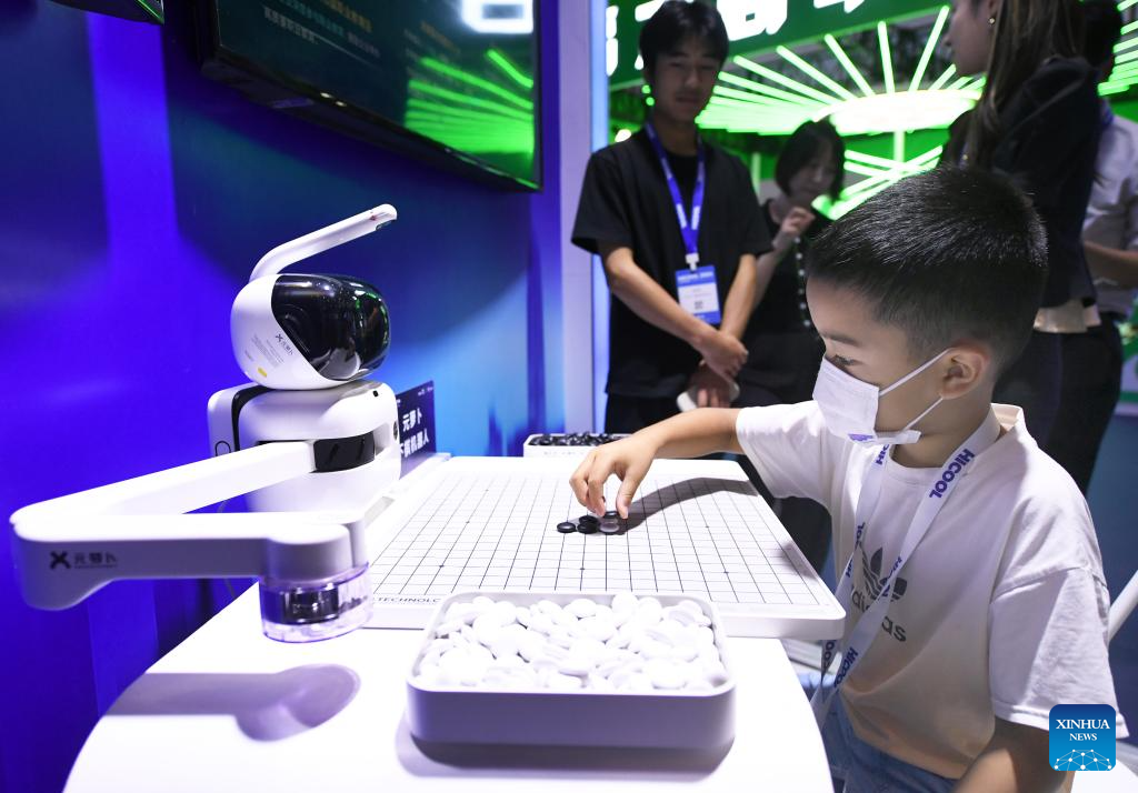 A boy plays chess with a robot at the exhibition area of HICOOL 2024 Global Entrepreneur Summit in Beijing, capital of China, Aug. 24, 2024. The global entrepreneur summit was held in Beijing from Friday to Sunday. (Xinhua/Ren Chao)