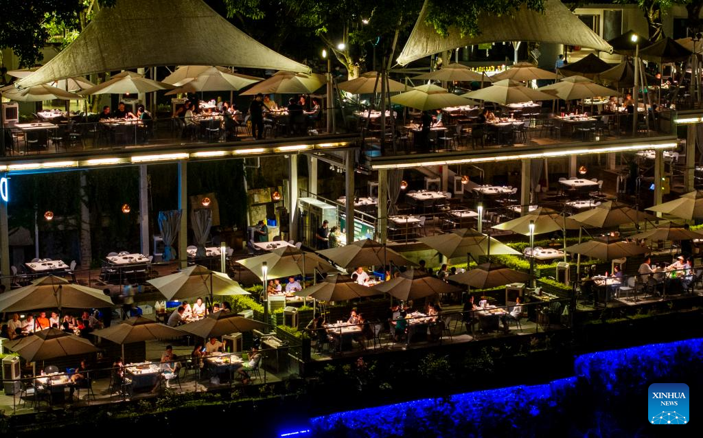 A drone photo taken on Aug. 23, 2024 shows tourists enjoying hotpot and the night view in a restaurant at the Nanshan scenic spot in Chongqing, southwest China. Renowned tourist destinations in Chongqing, a city known for its high temperatures, attract many tourists in summer. (Xinhua/Liu Chan)