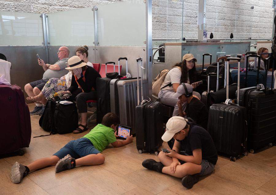 Stranded passengers wait at Ben Gurion International Airport in Tel Aviv, Israel, Aug. 25, 2024. (Xinhua/Chen Junqing)