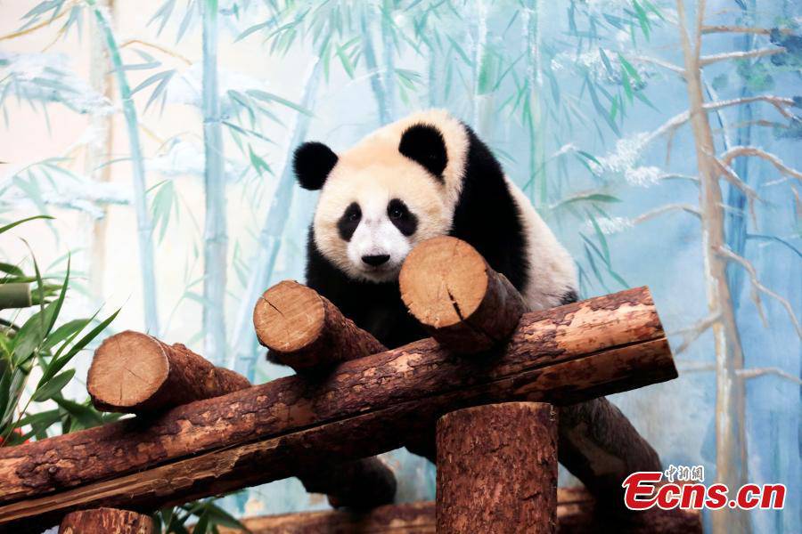 Giant panda cub Katyusha plays at Moscow Zoo in Russia, Aug. 24, 2024. (Photo: China News Service/Tian Bing)