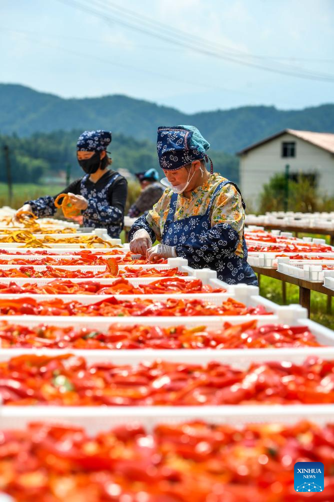 Villagers dry agricultural products in Lutian Village of Tonggu County, Yichun City, east China's Jiangxi Province, on Aug. 26, 2024. (Photo by Zhou Liang/Xinhua)