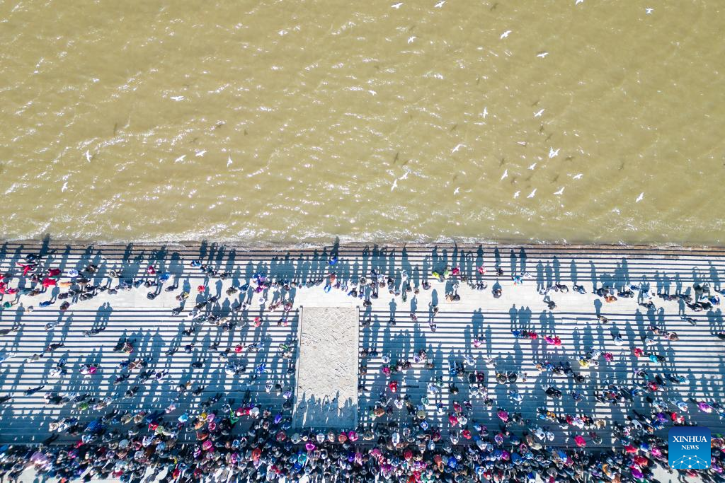 An aerial drone photo taken on April 19, 2024 shows people enjoying themselves along the Songhua River in Harbin, northeast China's Heilongjiang Province. Known as China's "Ice City", Harbin has a reputation for its cool weather and diversified attractions, even during the summer months, which helps it remain attractive to tourists throughout the year. (Xinhua/Zhang Tao)