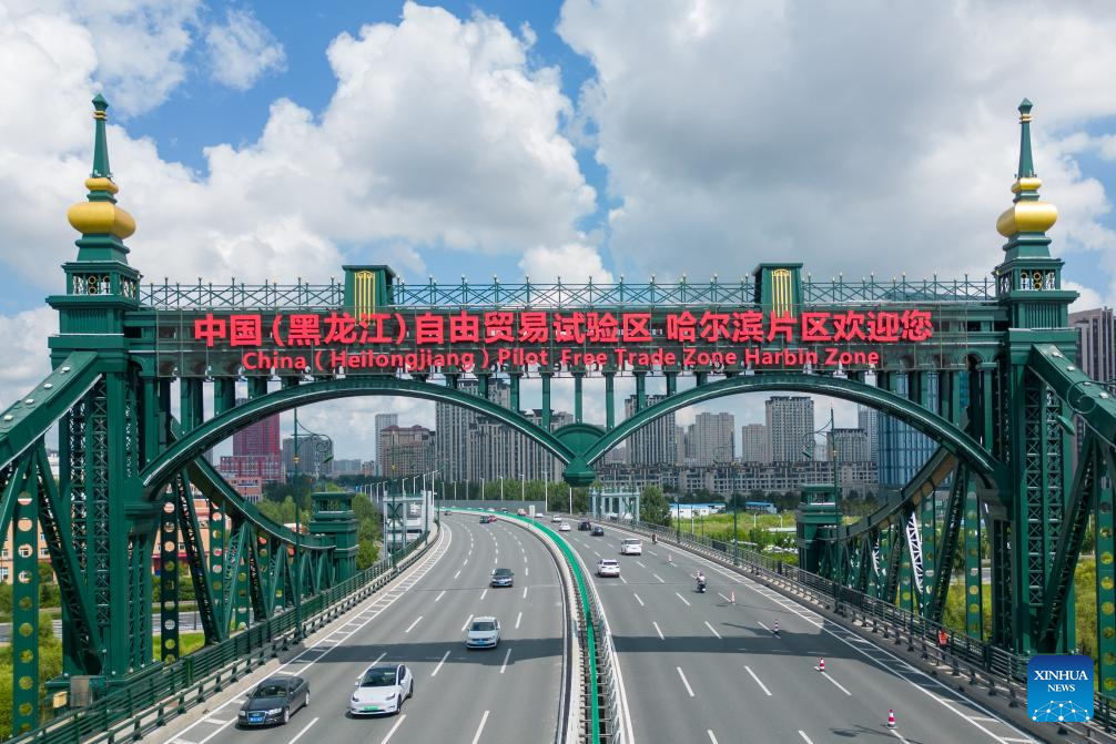 An aerial drone photo taken on Aug. 15, 2024 shows a view of the Harbin sub-area of Heilongjiang pilot free trade zone (FTZ) in Harbin, northeast China's Heilongjiang Province. Known as China's "Ice City", Harbin has a reputation for its cool weather and diversified attractions, even during the summer months, which helps it remain attractive to tourists throughout the year. (Xinhua/Zhang Tao)