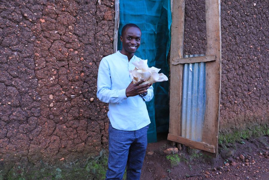Nyambo Obed shows the cultivated mushrooms at his workshop near Muhanga in Southern Province, Rwanda, April 6, 2024. (Xinhua/Dong Jianghui)