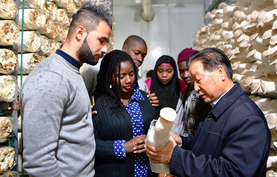 Lin Zhanxi (1st R) from Fujian Agriculture and Forestry University introduces Juncao technology to African students in Fuzhou, southeast China's Fujian Province, Nov. 2, 2018. (Xinhua/Wei Peiquan)