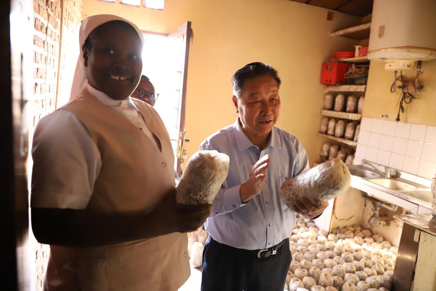 Lin Zhanxi (R), a professor from China's Fujian Agriculture and Forestry University, visits a mushroom growing shed in Kigali, Rwanda, on Aug. 2, 2024. (Xinhua/Ji Li)