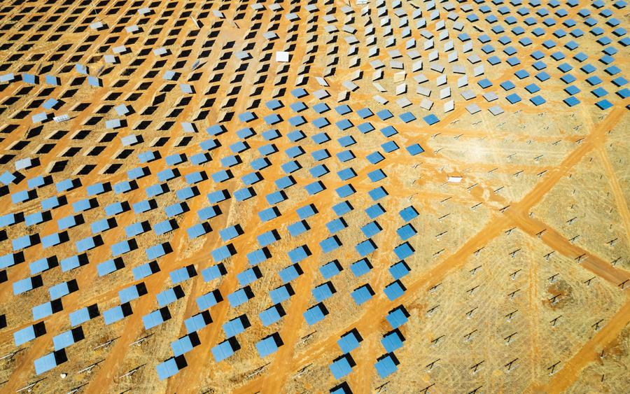 An aerial drone photo taken on Aug. 20, 2024 shows reflector arrays of the Redstone Concentrated Solar Thermal Power Project near Postmasburg in Northern Cape Province of South Africa. (Xinhua/Zhang Yudong)