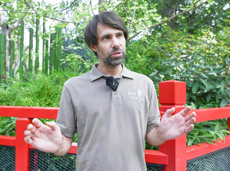 Biologist and panda curator Florian Sicks speaks to media at Zoo Berlin in Berlin, Germany, Aug. 23, 2024. (Xinhua/Ren Pengfei)