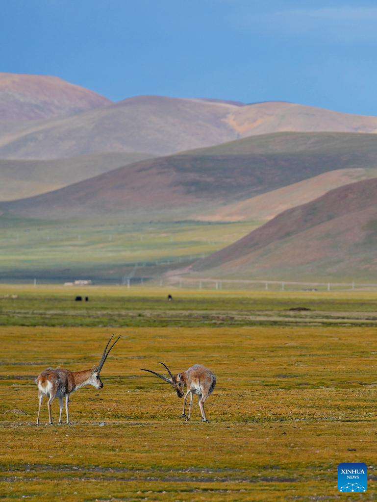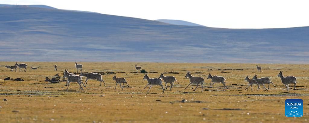 Tibetan antelopes are pictured in Serling Tso national nature reserve in Nagqu City, southwest China's Xizang Autonomous Region, Aug. 26, 2024. (Xinhua/Zhang Rufeng)