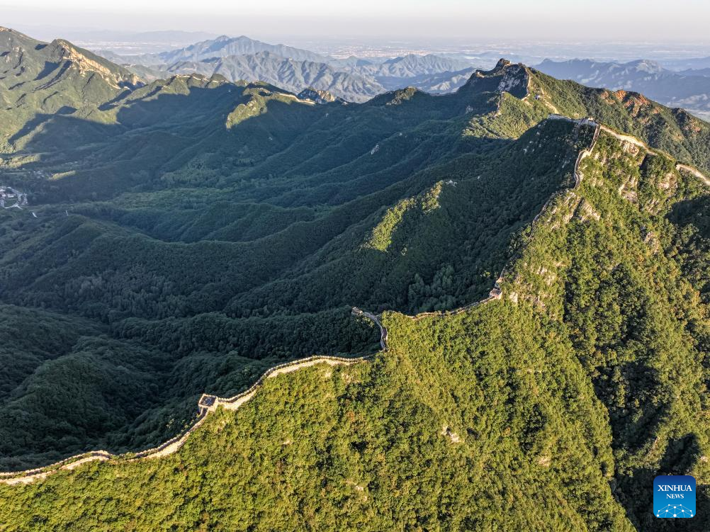 An aerial drone photo taken on Aug. 27, 2024 shows the Jiuyanlou and Jiankou sections of the Great Wall in Beijing, capital of China. (Xinhua/Chen Yehua)