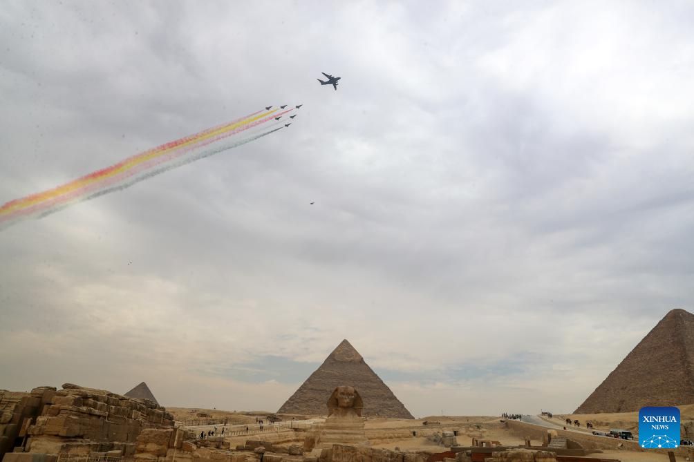 A Y-20, China's domestically developed large transport aircraft, and J-10 stealth fighter jets from the Bayi Aerobatic Team fly over the Giza Pyramids scenic spot in Giza, Egypt, Aug. 28, 2024. The flight formation is in Egypt for an air show, scheduled from Sept. 3 to 5. (Xinhua/Wang Dongzhen)