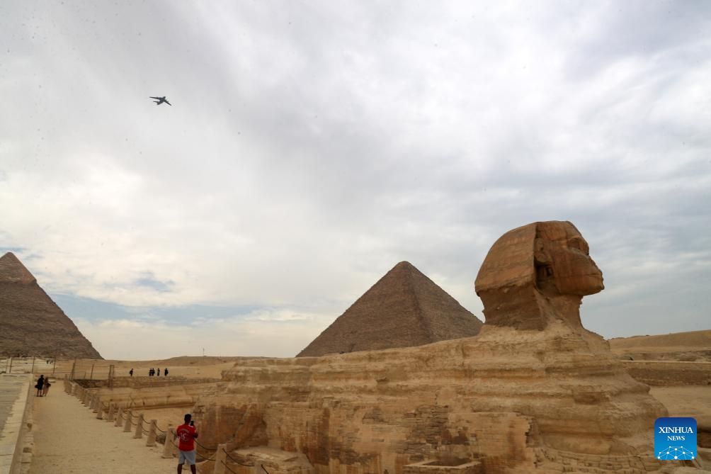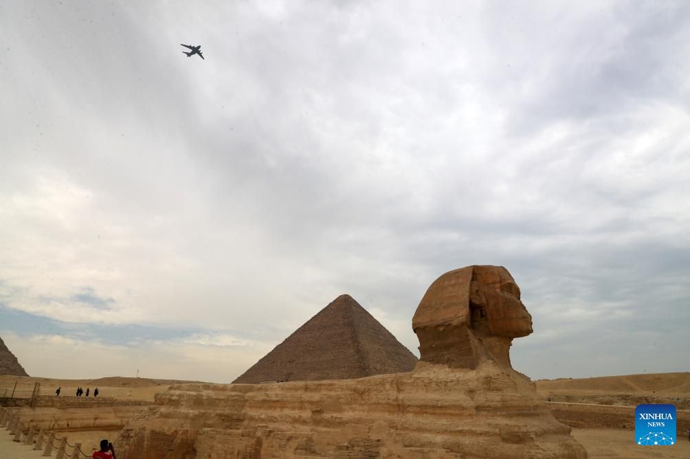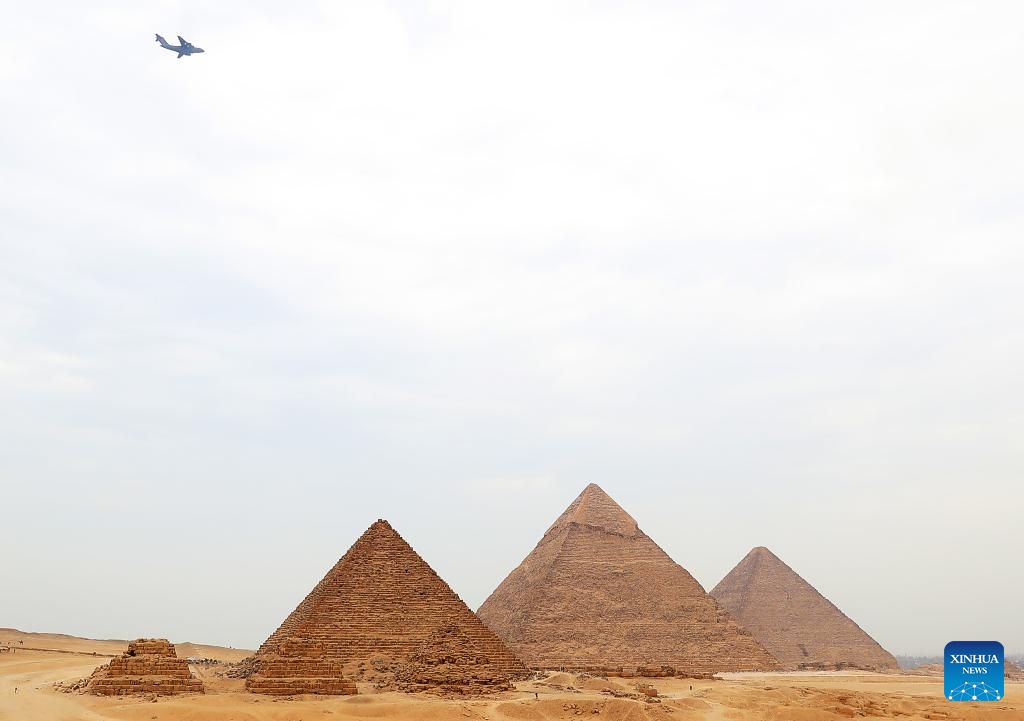 A Y-20, China's domestically developed large transport aircraft, flies over the Giza Pyramids scenic spot in Giza, Egypt, Aug. 28, 2024. The flight formation is in Egypt for an air show, scheduled from Sept. 3 to 5. (Xinhua/Sui Xiankai)