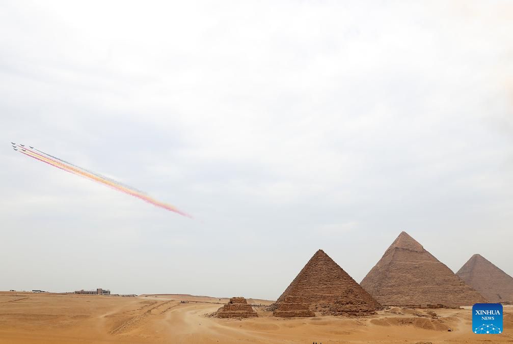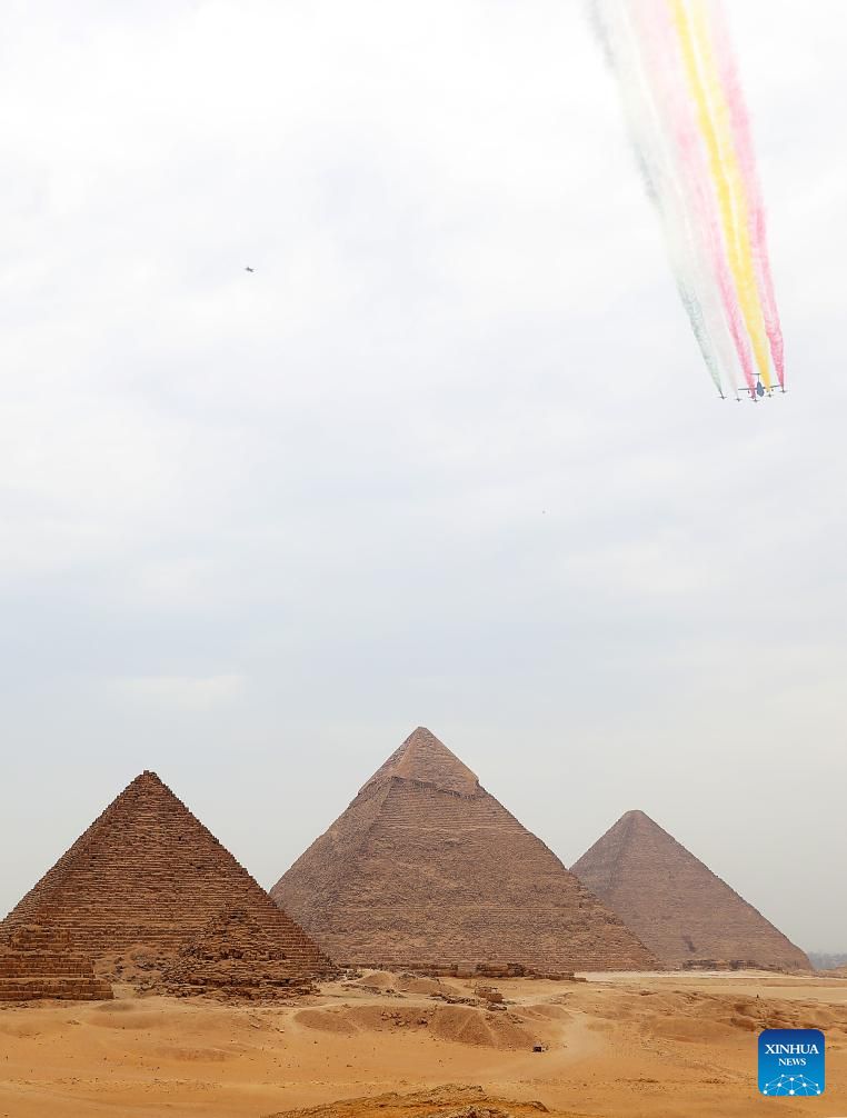 J-10 stealth fighter jets from the Bayi Aerobatic Team fly over the Giza Pyramids scenic spot in Giza, Egypt, Aug. 28, 2024. The flight formation is in Egypt for an air show, scheduled from Sept. 3 to 5. (Xinhua/Sui Xiankai)