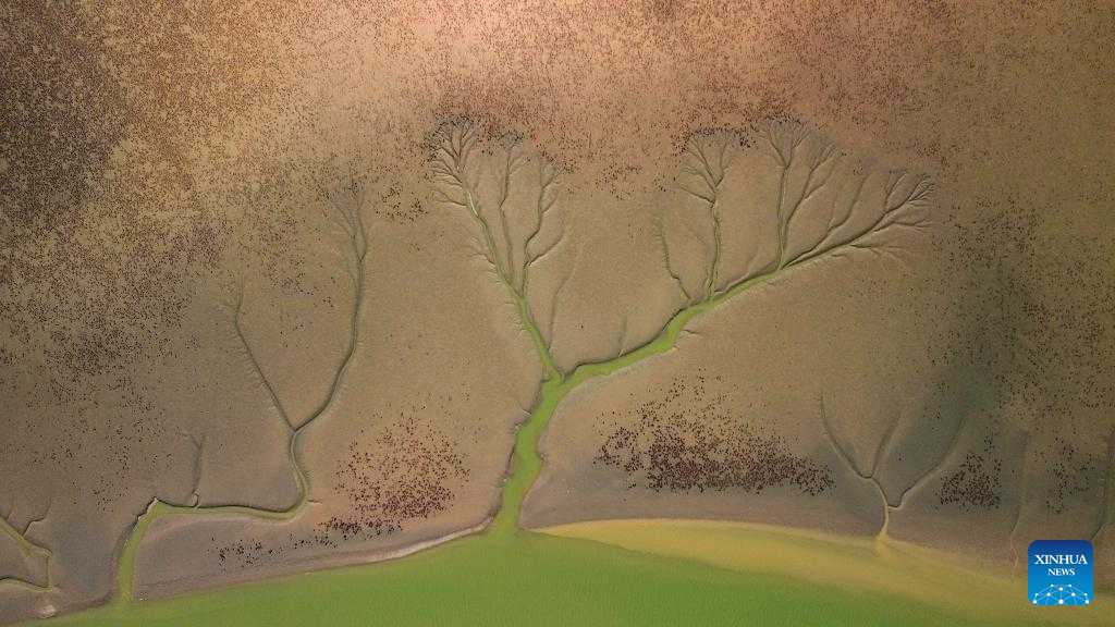 An aerial drone photo taken on Aug. 28, 2024 shows a view of the mudflats of the Yellow River Delta in Dongying, east China's Shandong Province. (Xinhua/Xu Suhui)