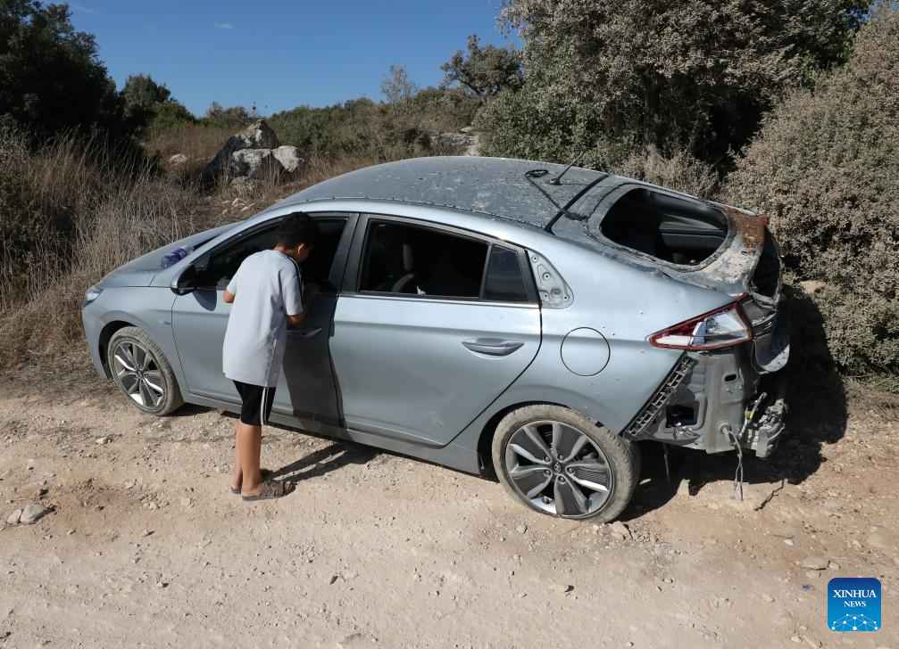 A Palestinian man inspects a vehicle attacked by Israeli warplanes in the Sir village, to the south of the northern West Bank city of Jenin, on Aug. 28, 2024. At least 10 Palestinians were killed on Wednesday by Israeli shelling and gunfire in the northern West Bank, according to the Ramallah-based Palestinian Health Ministry. (Photo by Nidal Eshtayeh/Xinhua)