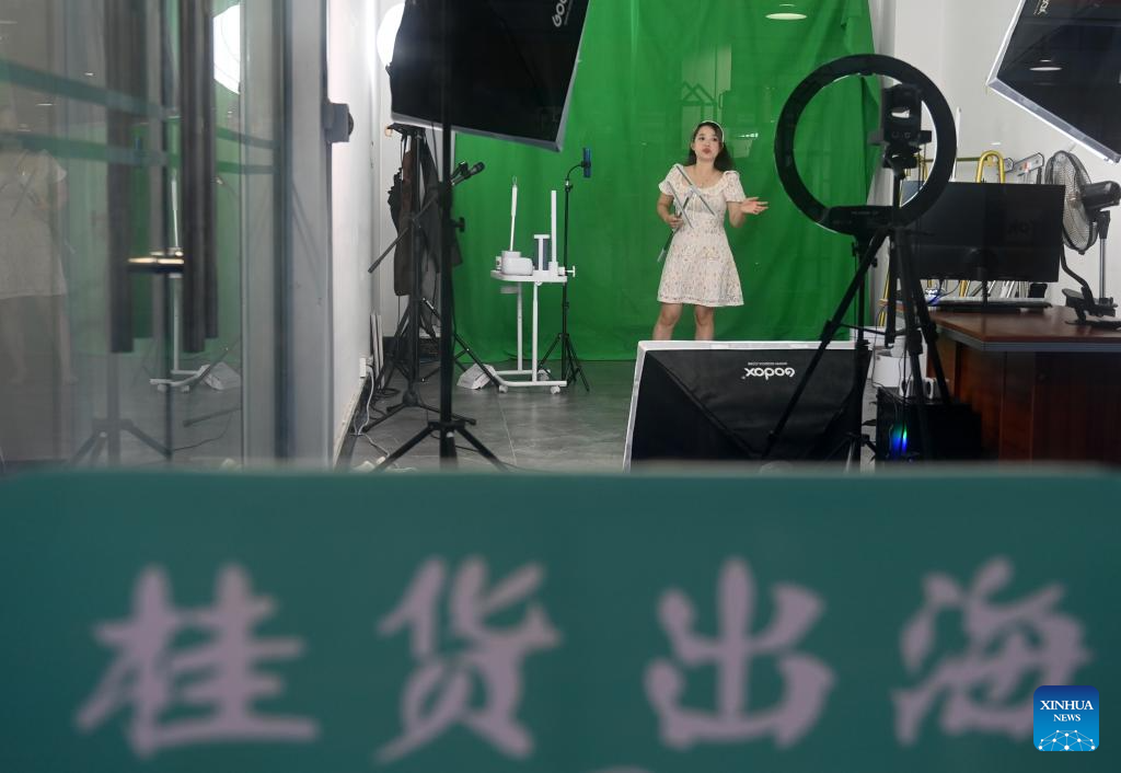A staff member sells products via livestreaming at a cross-border e-commerce live broadcast base in Pingxiang City, south China's Guangxi Zhuang Autonomous Region, Aug. 26, 2024. To fully avail of its unique geological position, Guangxi has scaled up the efforts to accelerate opening up and promote cross-border trade and international cooperation in recent years. (Xinhua/Lu Boan)