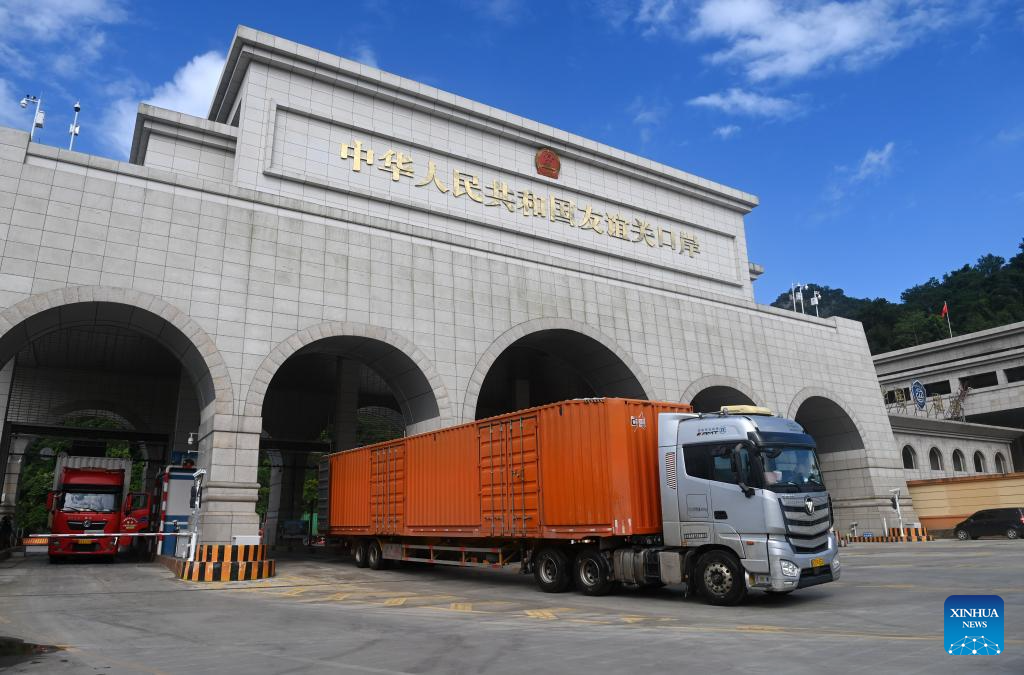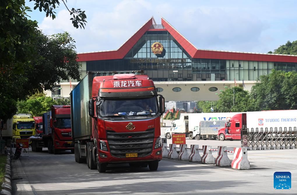 Vehicles carrying imported goods head for Youyiguan Port in Pingxiang City, south China's Guangxi Zhuang Autonomous Region, Aug. 26, 2024. To fully avail of its unique geological position, Guangxi has scaled up the efforts to accelerate opening up and promote cross-border trade and international cooperation in recent years. (Xinhua/Lu Boan)