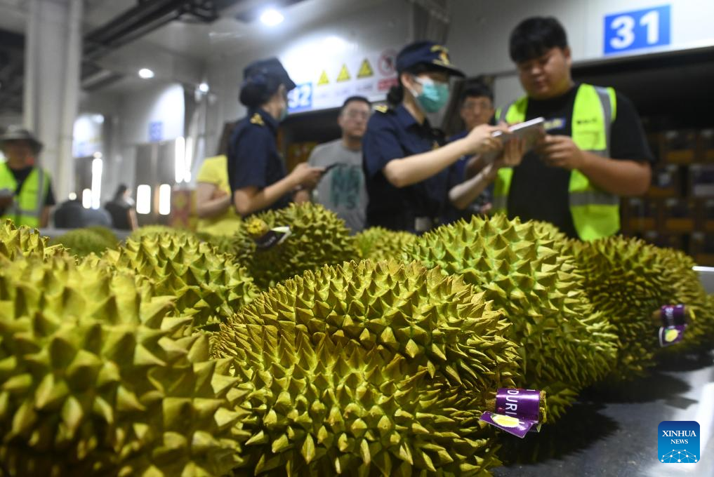 Customs staff members check imported durians at Youyiguan Port in Pingxiang City, south China's Guangxi Zhuang Autonomous Region, Aug. 26, 2024. To fully avail of its unique geological position, Guangxi has scaled up the efforts to accelerate opening up and promote cross-border trade and international cooperation in recent years. (Xinhua/Lu Boan)