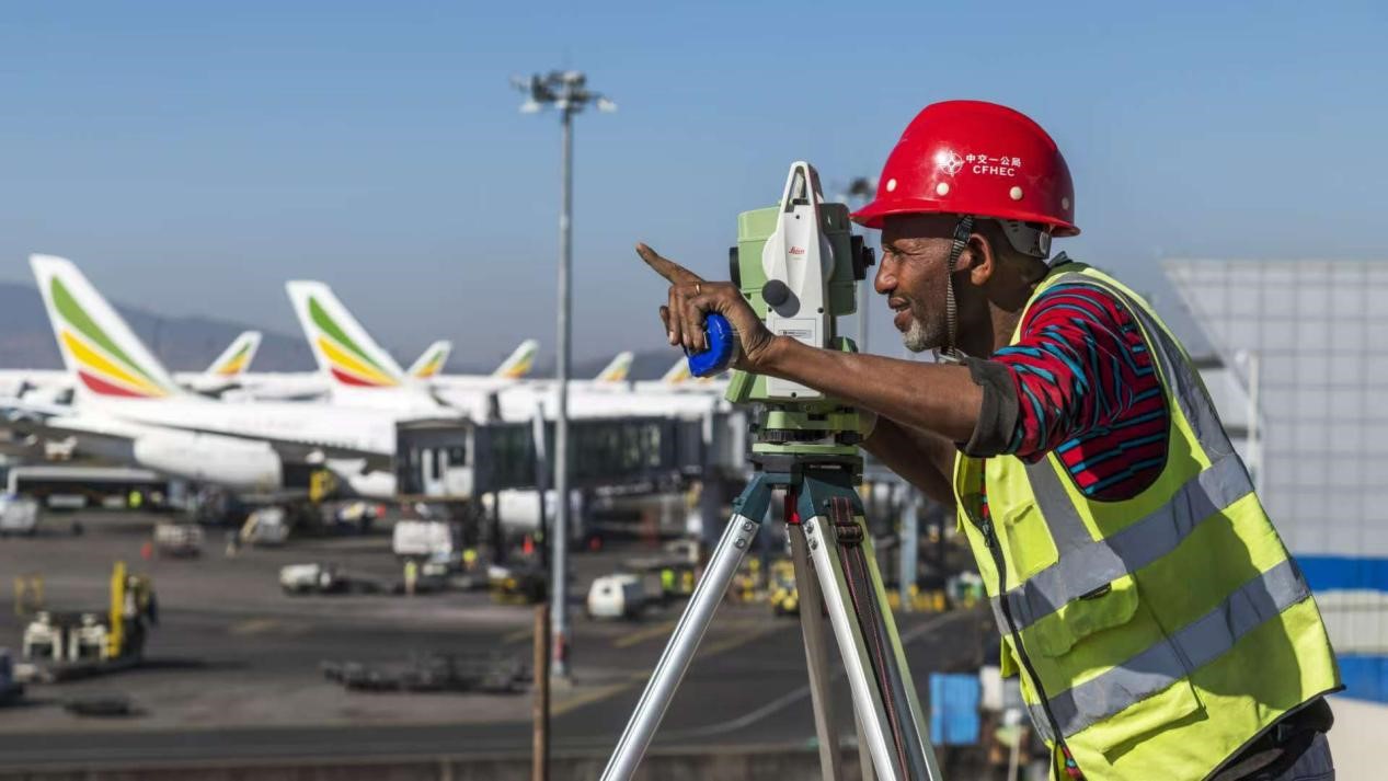 An Ethiopian employee of China First Highway Engineering Co., Ltd. is doing a survey task for a new terminal at Bole International Airport, Addis Ababa, Ethiopia. (People's Daily/Huang Peizhao)