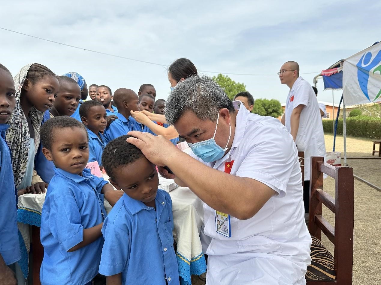 A health checkup is conducted for local children by the 18th Chinese medical team to Chad. (Photo/Wang Lini)