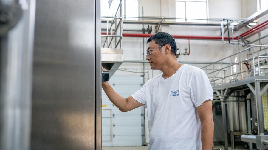 A worker operates the equipment at a workshop of German gelatin manufacturer Gelita in Liaoyuan City, northeast China's Jilin Province, Aug. 16, 2024. (Xinhua/Tang Chengzhuo)