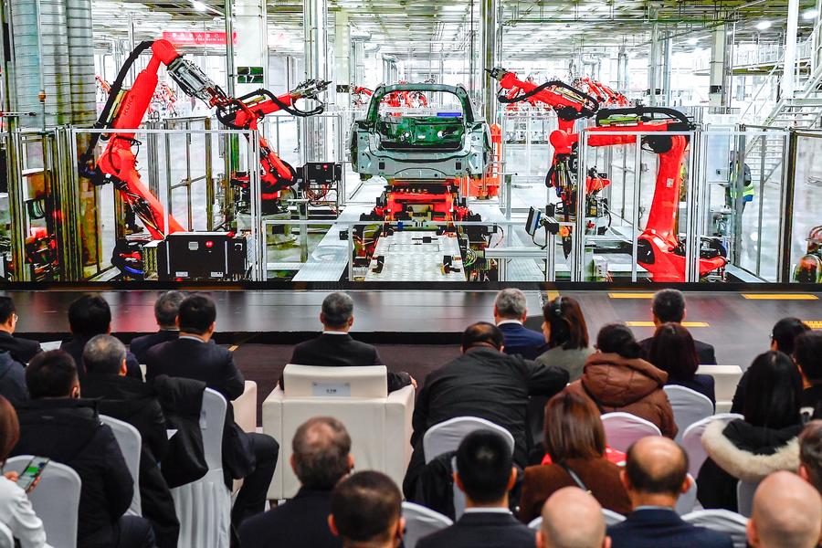 Guests watch an introduction video of the Audi FAW NEV Co., Ltd. in Changchun, northeast China's Jilin Province, Jan. 26, 2024. (Xinhua/Xu Chang)