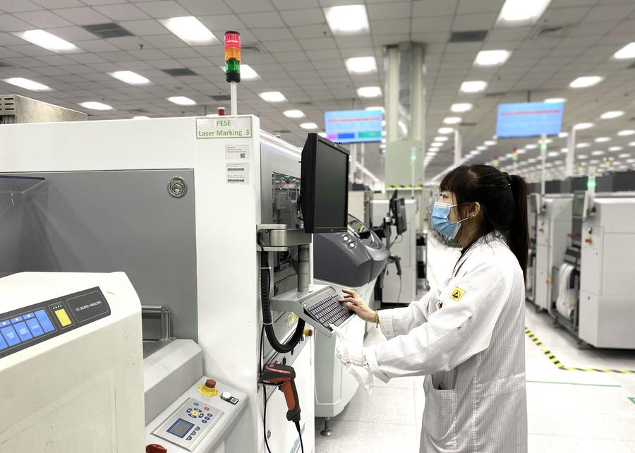 A staff member operates at a workshop of Vitesco Automotive Changchun Co., Ltd. in Changchun, northeast China's Jilin Province, April 21, 2023. (Xinhua/Si Xiaoshuai)