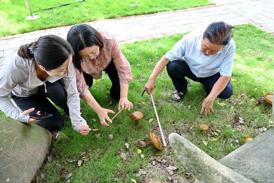 Lin Zhanxi (R) and his daughter Lin Dongmei (C) check a wild fungus in Fuzhou, southeast China's Fujian Province, Aug. 26, 2024. (Xinhua/Lin Shanchuan)