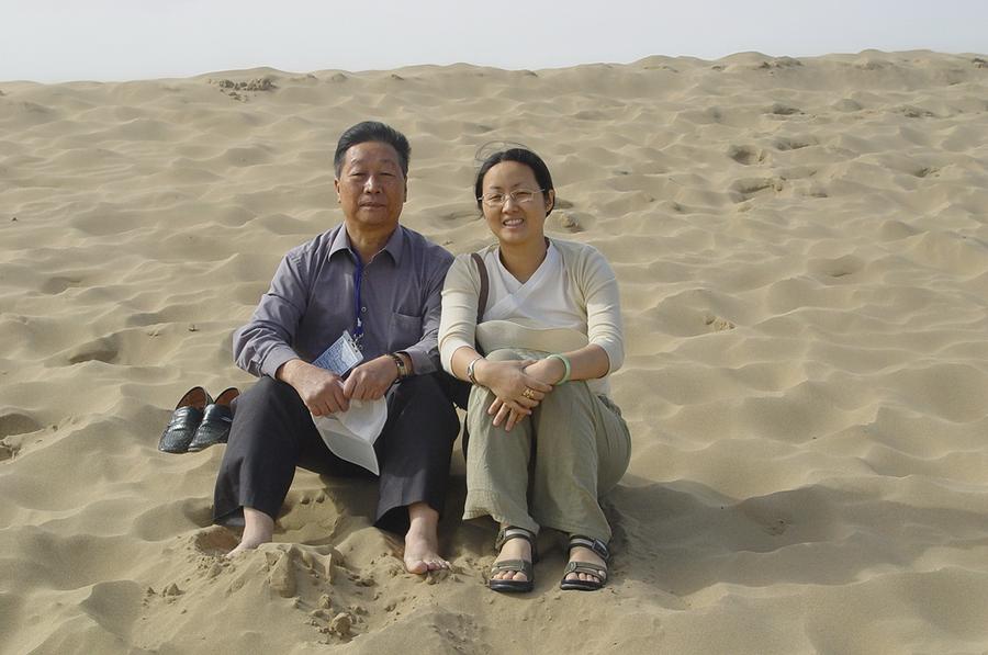 Lin Zhanxi (L) and his daughter Lin Dongmei pose for photo in the Sahara Desert in Egypt, Sept. 16, 2005. (Xinhua)