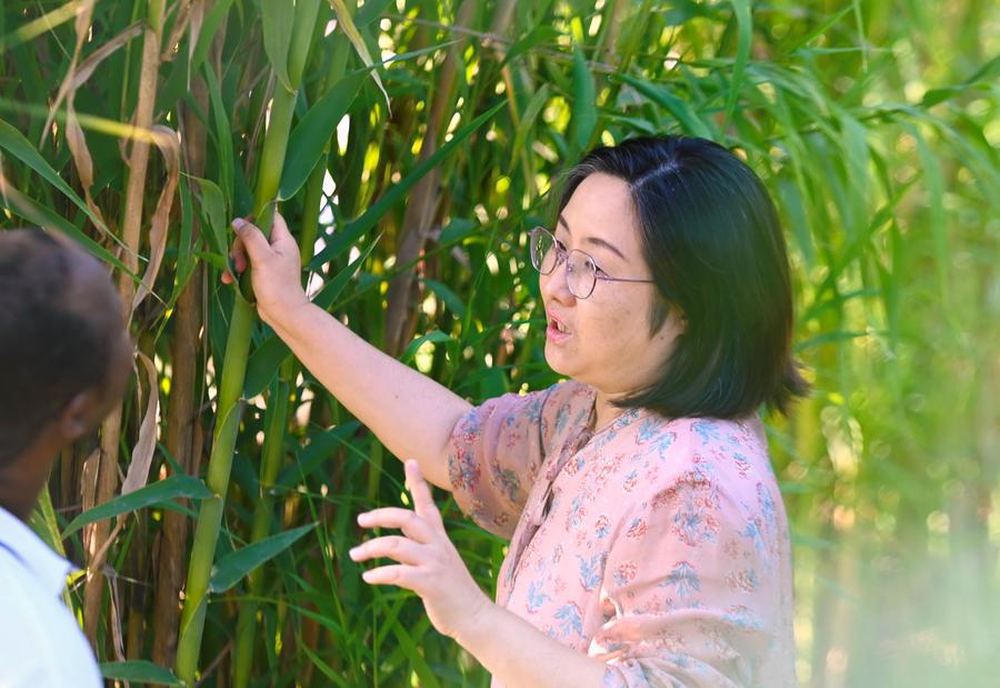 Lin Dongmei introduces a Juncao plant to Rwandan students at Fujian Agriculture and Forestry University in Fuzhou, southeast China's Fujian Province, Aug. 26, 2024. (Xinhua/Lin Shanchuan)