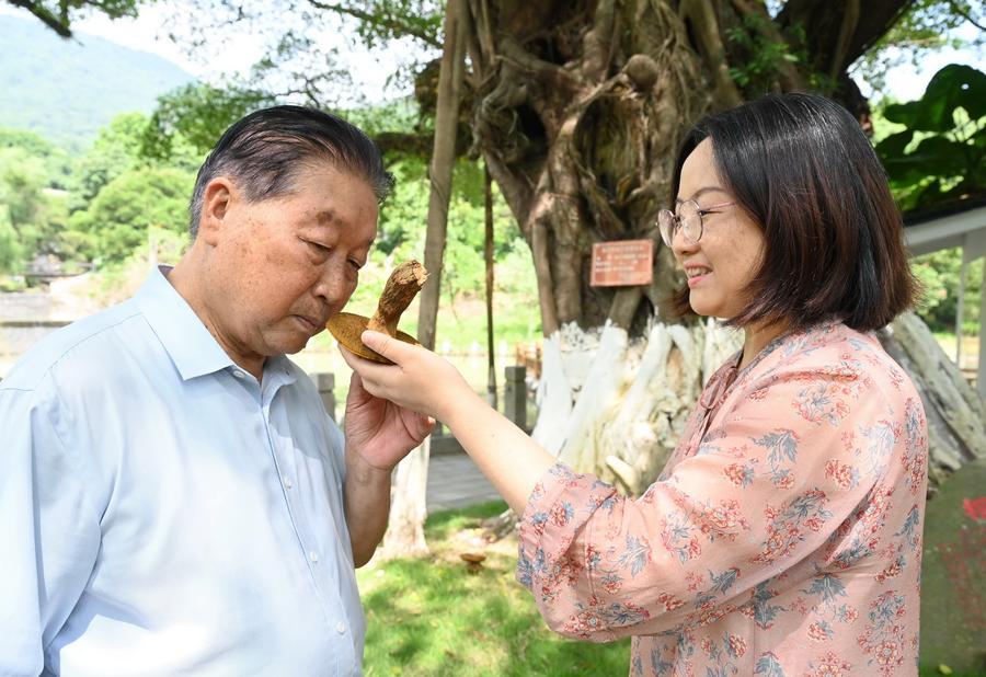Lin Zhanxi smells a wild fungus in Fuzhou, southeast China's Fujian Province, Aug. 26, 2024. (Xinhua/Lin Shanchuan)