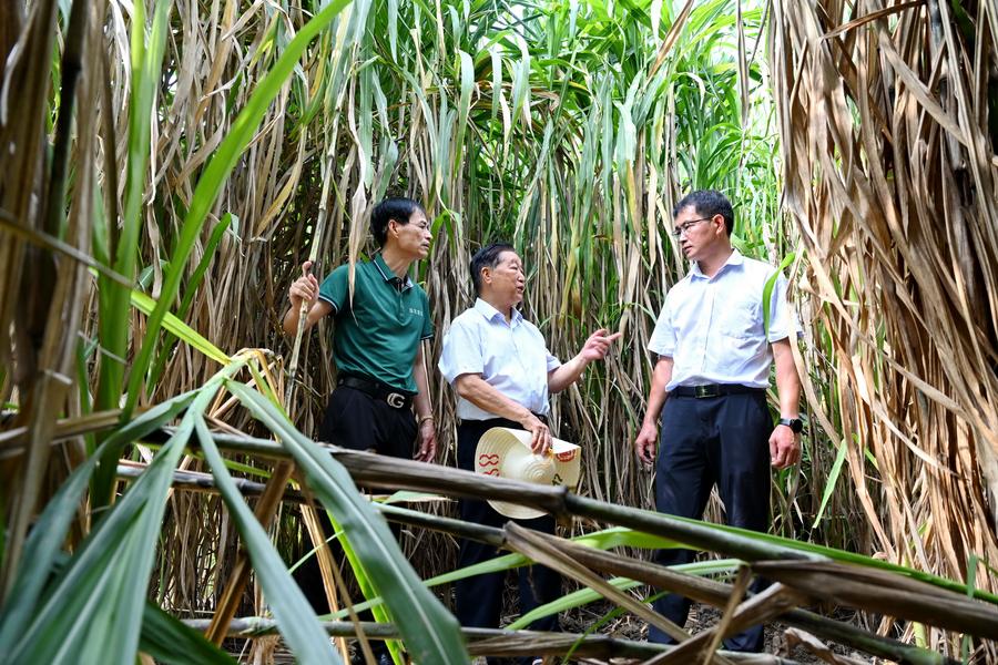 Lin Zhanxi (C) checks growth of Juncao in Yongtai County in Fuzhou, southeast China's Fujian Province, Aug. 28, 2024. (Xinhua/Lin Shanchuan)