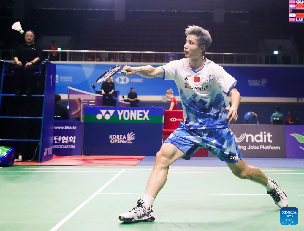 Shi Yuqi of China competes during the men's singles quarterfinal match against Lee Cheuk Yiu of China's Hongkong at the BWF Korea Open Badminton Championships 2024 in Mokpo, South Korea, Aug. 30, 2024. (Xinhua/Yao Qilin)