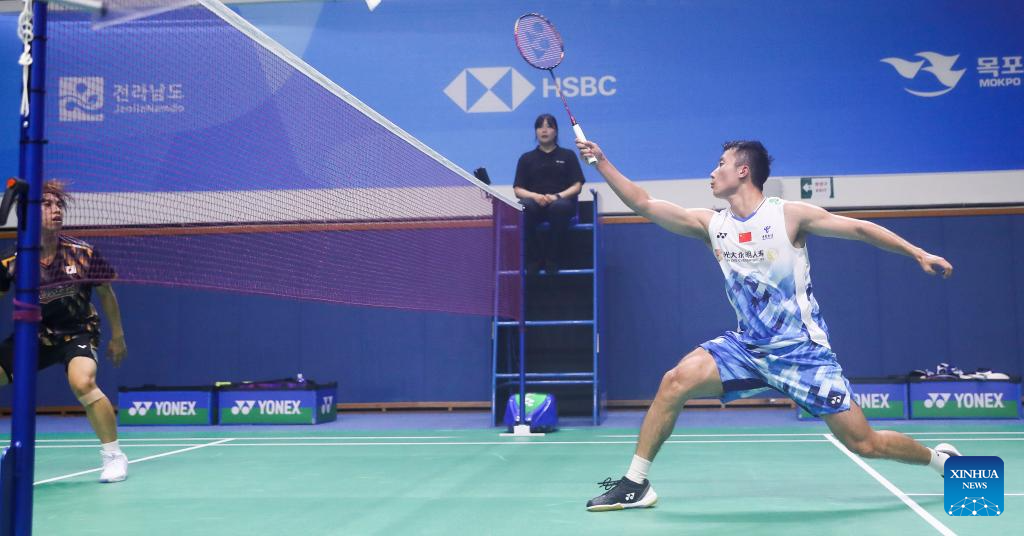 Lu Guangzu of China competes during the men's singles quarterfinal match against Naraoka Kodai of Japan at the BWF Korea Open Badminton Championships 2024 in Mokpo, South Korea, Aug. 30, 2024. (Xinhua/Yao Qilin)