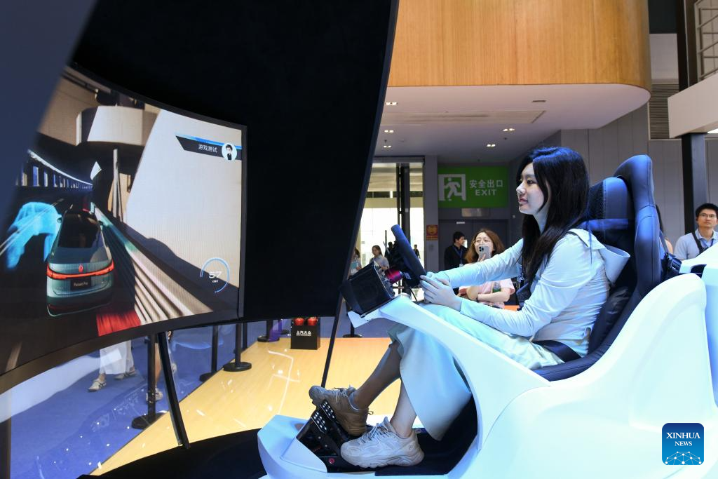 A visitors tries a simulated driving device during Chengdu Motor Show 2024 in Chengdu, southwest China's Sichuan Province, Aug. 30, 2024. The Chengdu Motor Show 2024 kicked off here on Friday. Nearly 130 Chinese and foreign car companies made appearance during the motor show, with more than 1,600 vehicles on display. (Xinhua/Tang Wenhao)