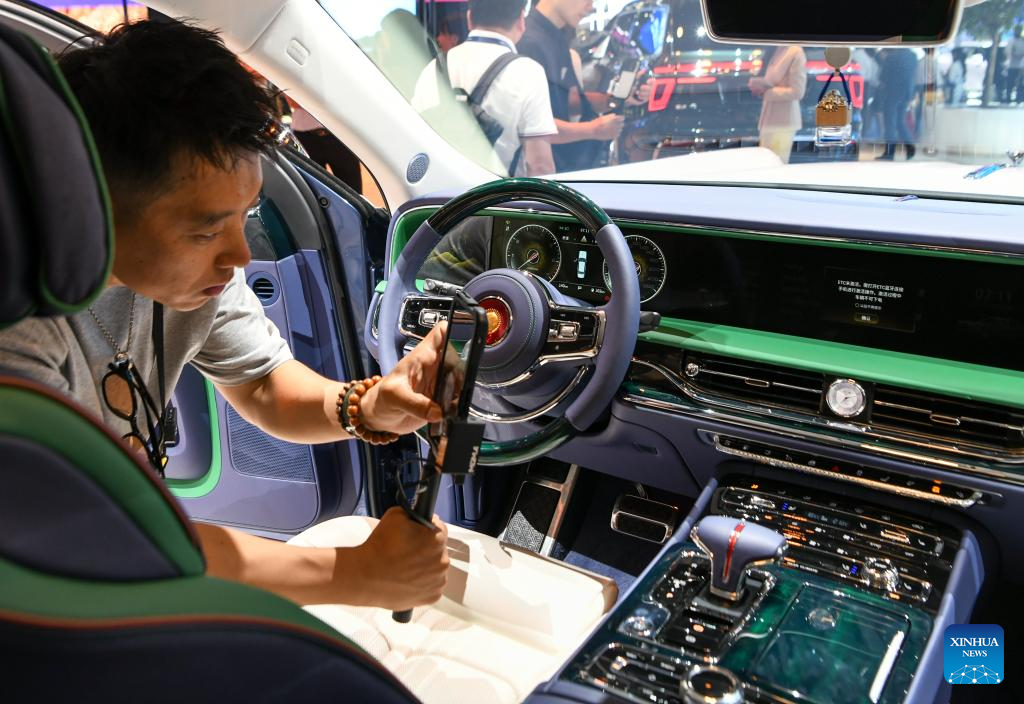 A visitor takes photos inside a Hongqi vehicle during Chengdu Motor Show 2024 in Chengdu, southwest China's Sichuan Province, Aug. 30, 2024. The Chengdu Motor Show 2024 kicked off here on Friday. Nearly 130 Chinese and foreign car companies made appearance during the motor show, with more than 1,600 vehicles on display. (Xinhua/Tang Wenhao)