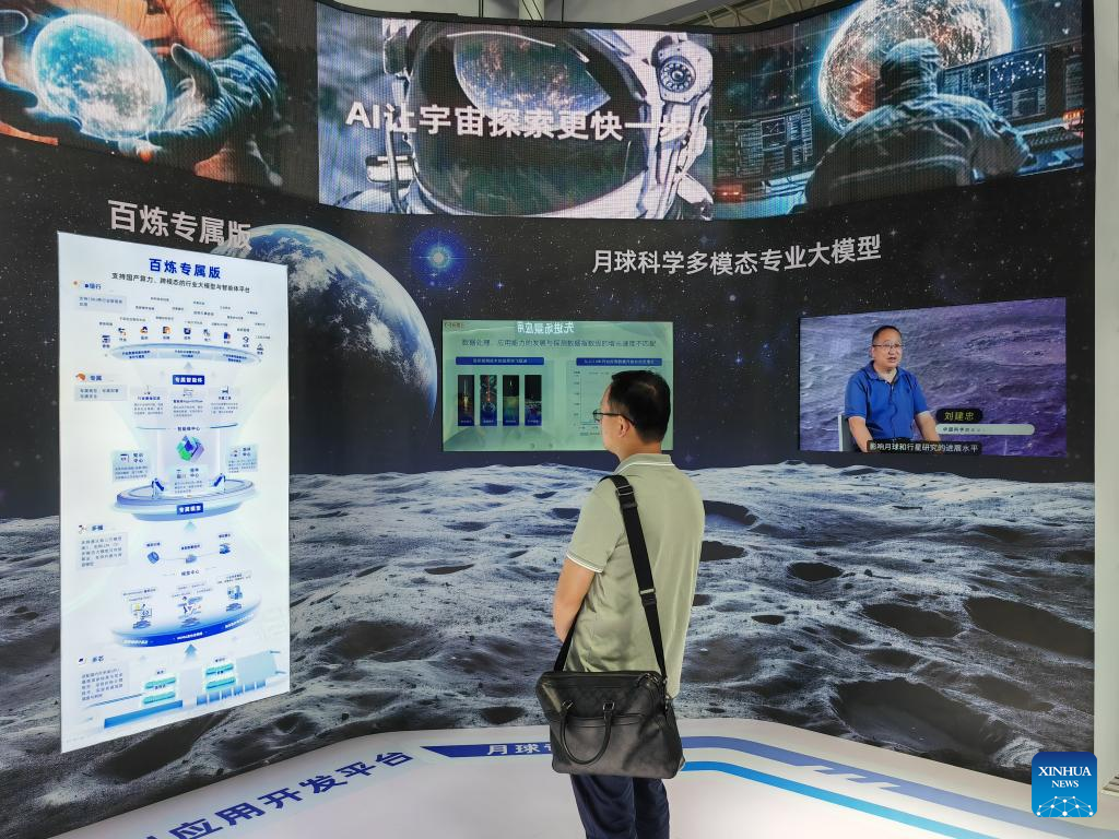 A visitor learns about the world's first professional, multimodal large language model (LLM) for the field of lunar science during the China International Big Data Industry Expo in Guiyang, southwest China's Guizhou Province, on Aug. 29, 2024. (Xinhua/Xiang Dingjie)