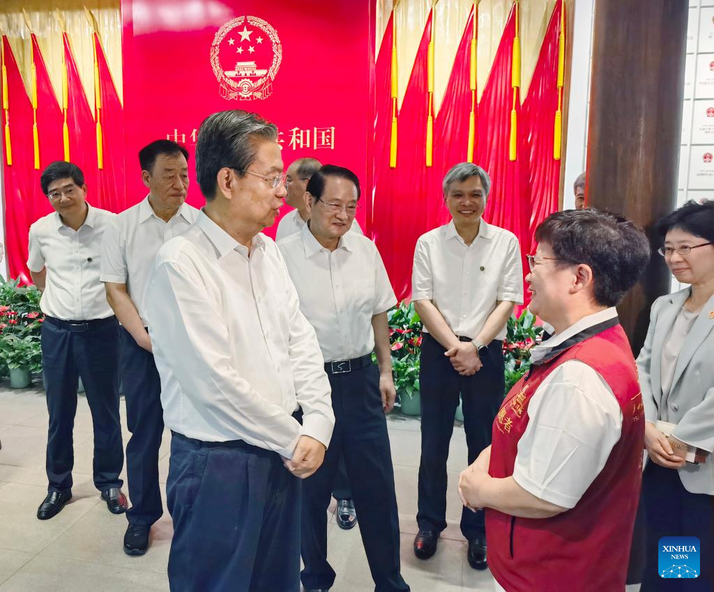 Zhao Leji, a member of the Standing Committee of the Political Bureau of the Communist Party of China Central Committee and chairman of the National People's Congress Standing Committee, visits a practicing center of whole-process people's democracy in Hangzhou, east China's Zhejiang Province, Aug. 28, 2024. Zhao made an inspection tour in east China's Zhejiang Province and Shanghai Municipality that began on Wednesday and ended on Friday. (Xinhua/Liu Weibing)