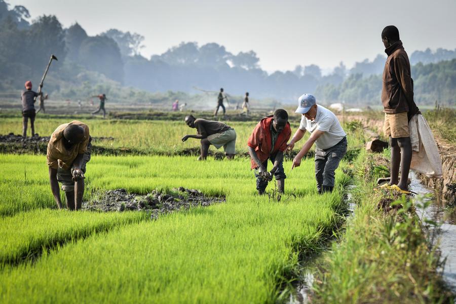 Zheng Ruijin (2nd R), a Chinese rice expert, instructs as farmers transplant rice seedlings at a paddy field in Huye District, Rwanda, Aug. 14, 2024. (Xinhua/Han Xu)