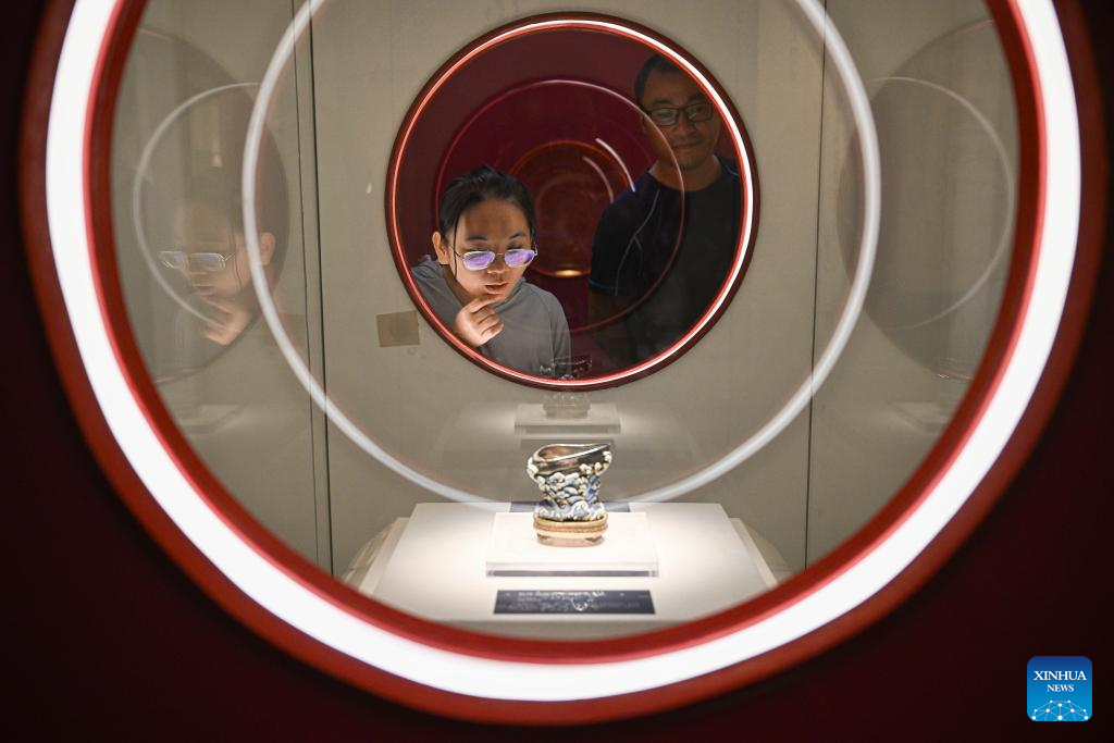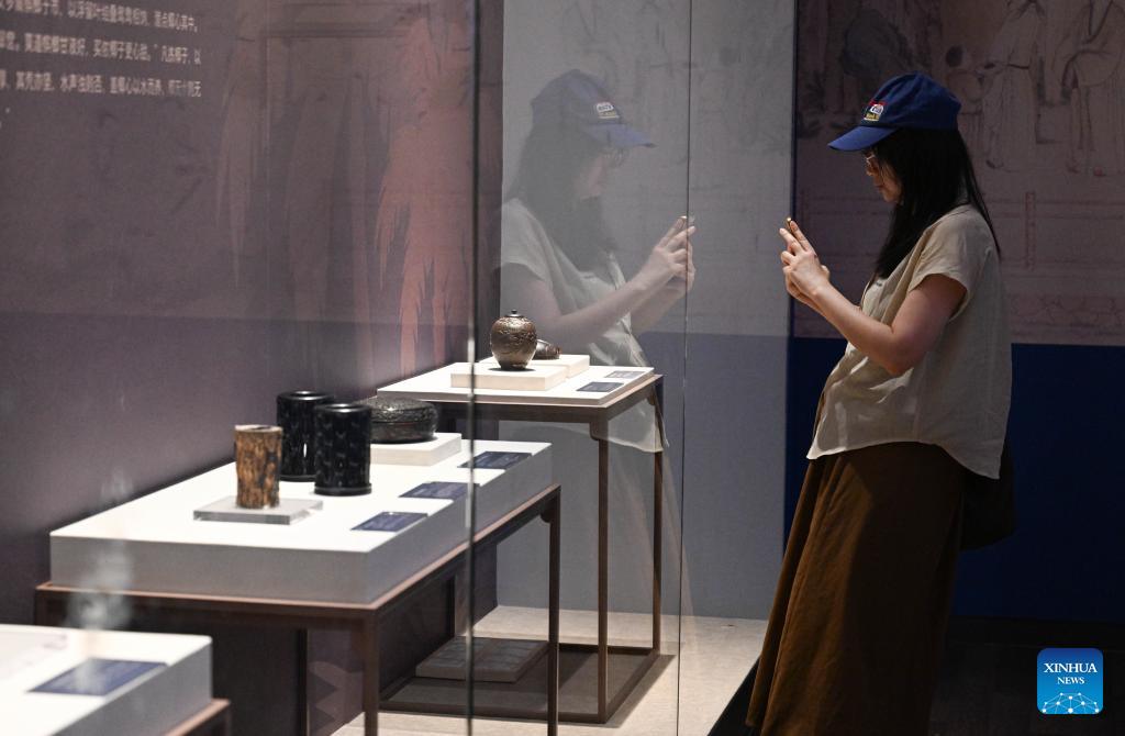 A visitor takes photos of the exhibits at Hainan Museum in Haikou, south China's Hainan Province, Aug. 31, 2024. An ongoing exhibition showcasing Hainan's cultural relics collected by the Palace Museum is held at Hainan Museum. A total of 96 exhibits with Hainan characteristics are on display including traditional furniture, ornaments and stationery, etc. (Xinhua/Pu Xiaoxu)