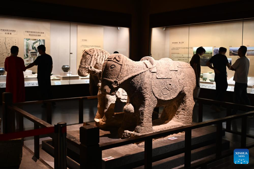 Stone statues of horses are seen in Ningxia Museum in Yinchuan, capital of northwest China's Ningxia Hui Autonomous Region, Sept. 1, 2024. As one of China's national first-grade museums, Ningxia Museum showcases the rich culture and history of Ningxia. (Xinhua/Mao Zhu)