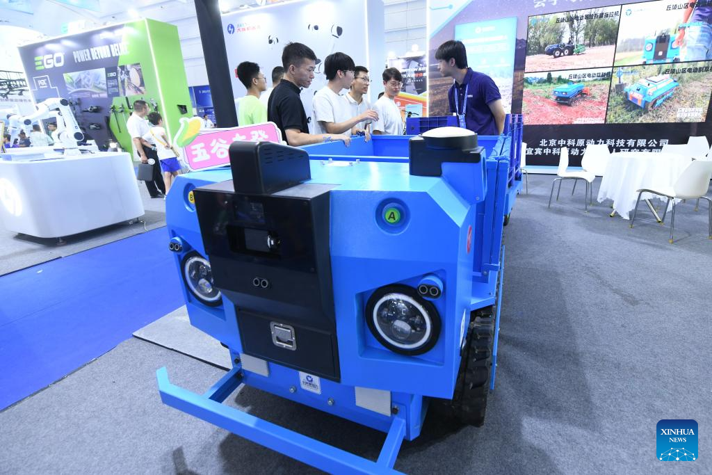 A transportation robot is on display during an exhibition of the 2024 World Power Battery Conference in Yibin, southwest China's Sichuan Province, Sept. 1, 2024. (Xinhua/Tang Wenhao)