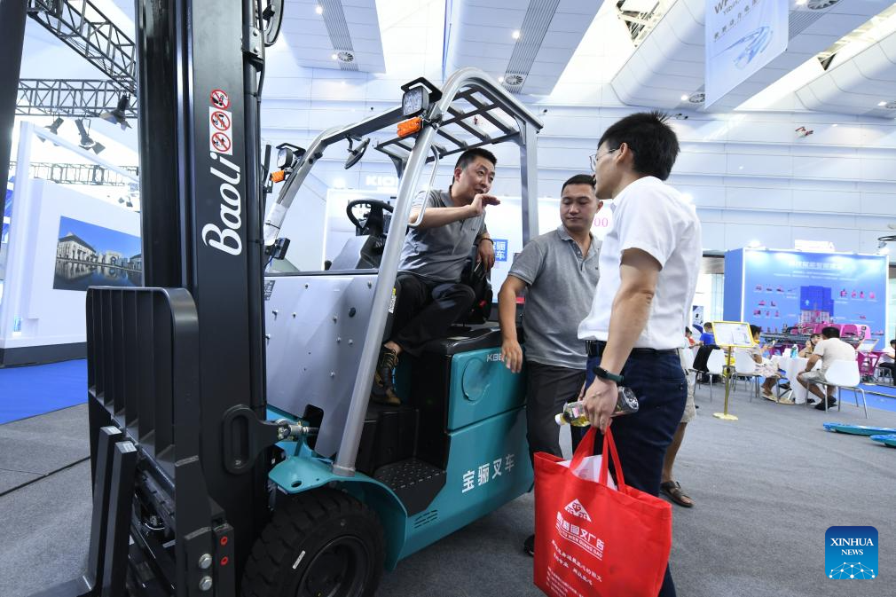 An exhibitor introduces an electric forklift during an exhibition of the 2024 World Power Battery Conference in Yibin, southwest China's Sichuan Province, Sept. 1, 2024. (Xinhua/Tang Wenhao)