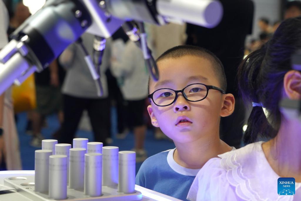 A child watches a robotic arm during an exhibition of the 2024 World Power Battery Conference in Yibin, southwest China's Sichuan Province, Sept. 1, 2024. (Xinhua/Tang Wenhao)