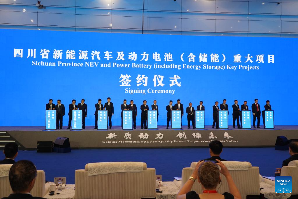 A signing ceremony is pictured during the 2024 World Power Battery Conference in Yibin, southwest China's Sichuan Province, Sept. 1, 2024. (Xinhua/Tang Wenhao)