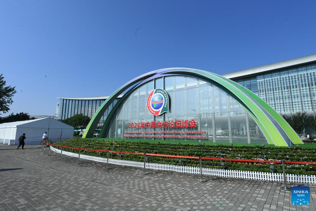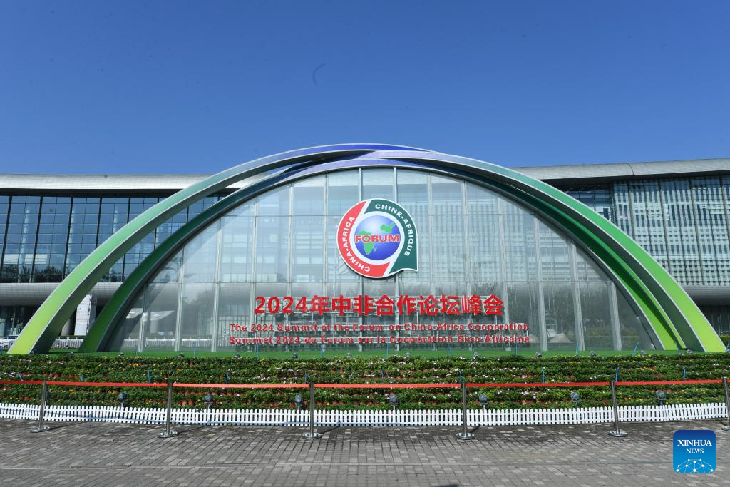 This photo taken on Aug. 29, 2024 shows the logo of the 2024 Summit of the Forum on China-Africa Cooperation (FOCAC) near China National Convention Center in Beijing, capital of China. The FOCAC summit is scheduled to take place in Beijing from Sept. 4 to 6. (Xinhua/Ren Chao)