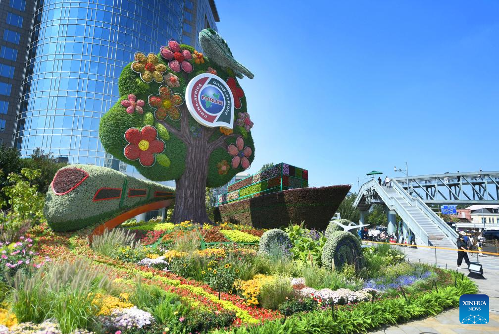 A floral decoration marking the 2024 Summit of the Forum on China-Africa Cooperation (FOCAC) is pictured in Dongcheng District of Beijing, capital of China, Aug. 29, 2024. The FOCAC summit is scheduled to take place in Beijing from Sept. 4 to 6. (Xinhua/Ren Chao)