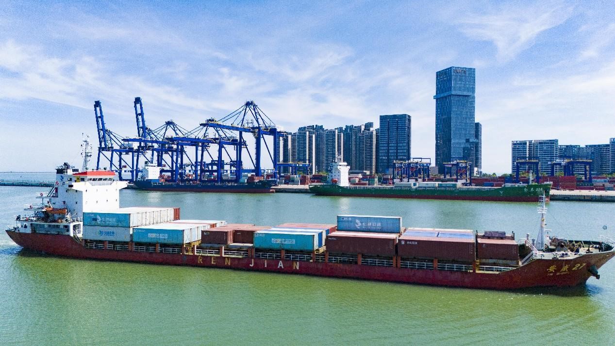 A cargo vessel fully loaded with containers arrives at a container terminal of the Xiuying port, Haikou, south China's Hainan province. (People's Daily Online/Zhang Junqi)