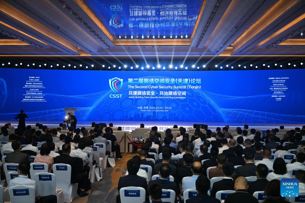 This photo shows the second Cyber Security Summit (Tianjin) (CSST) in north China's Tianjin municipality, Sept. 4, 2024. The second CSST is held here under the theme "Jointly Building Cyber Security and Governing Cyberspace." (Xinhua/Sun Fanyue)